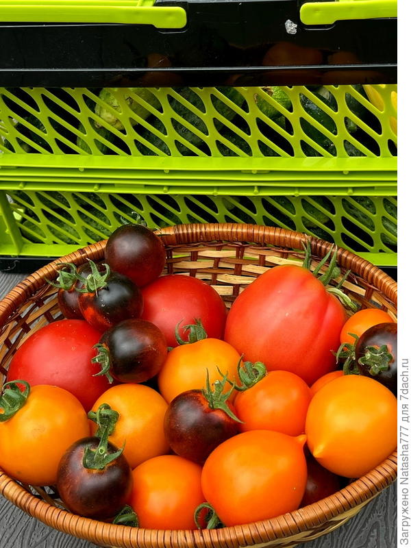 В этом году посадила томаты с плодами сливки разных сортов, должны быть и оранжевые, и полосатые, жду. Хочу вялить. Часть в теплице, часть на улице. У меня сделаны большие ящики для томатов у стены дома и у стены бани, там нет осадков и им теплее, и главное сухо.