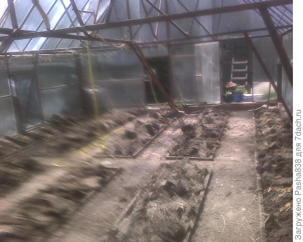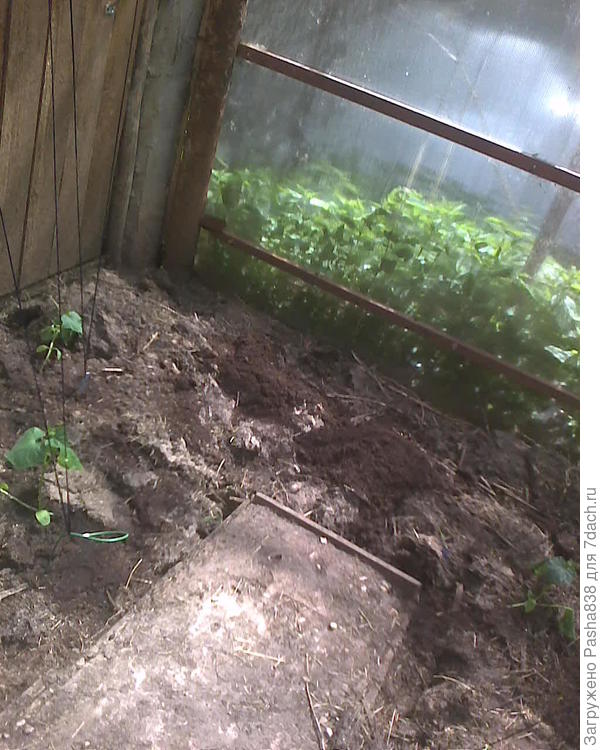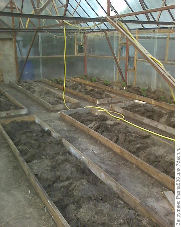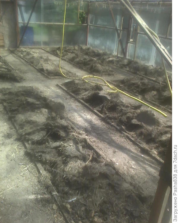 Ну и грязную подстилку с навозом я с теплицы только с дорожки убирал, а в грядках — нет, там смешал. В принципе, должно обойтись, поливать я сегодня не буду, обычно плохо если хорошо полить — а потом холодина. Если не поливать то растение легче перенесет. А поливать буду уж завтра.