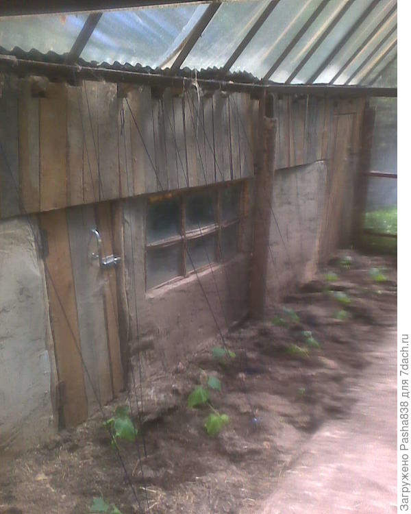 Фотка с утками — это когда я туда временно уток посадил, а новая часть теплицы с домиком — еще не были готовы, я их только-только заканчивал (торопясь до морозов). Успел тогда. Потолок у этого домика обит с двух сторон обрезной доской (ну или горбылём, строго говоря обито тем что было), а внутри настелены банеры старые от реклам (вместо пергамина), ну и завалено как следует разным утеплителем.