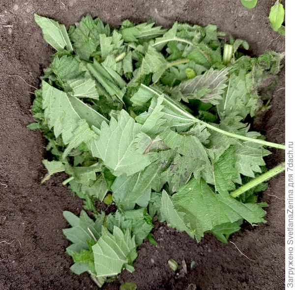 Так как руколу перекапывать было жалко, то я просто сделала лунки. В них на дно нарезала свежей крапивы. Порубила её дополнительно лопаткой, перемешивая с почвой. Добавила 1 ст. ложку рыбной муки. Перемешала с землёй. Добавила щепоть горчичного жмыха и 2 ст. ложки золы. Перемешала, присыпала землёй. Насыпала 2 горсти Биогумуса от ECOLOGICA и по 3 гранулы НВ-101. Перемешала. Залила дождевой водой из бочки, добавляя в неё кипяток, чтобы не застудить корни.