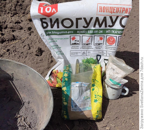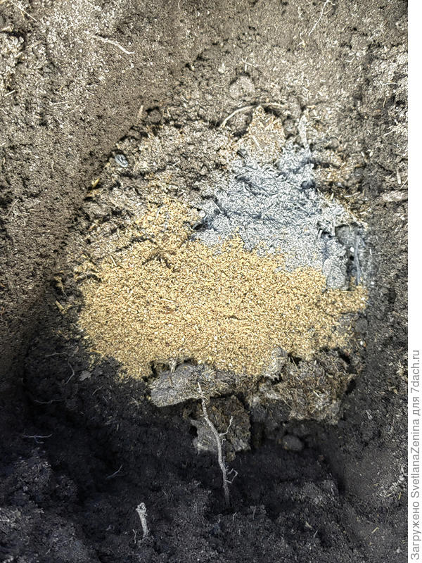В лунки добавила по 1 ст. ложке золы и горчичного жмыха, 2-3 гранулы НВ-101 и стакан биогумуса.