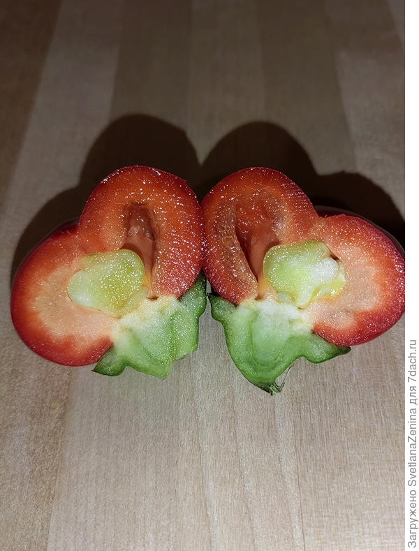 Перцы толстостенные. Вне зависимости от веса и размера толщина стенки 9-10 мм. На вкус отличные — сладкие, очень сочные, при этом хрустящие, как яблочко. При нарезке сок течет по пальцам и они становятся липкими от сладости. Перечный вкус слабо выражен. Зеленые плоды не горчат и также могут использоваться в еду.