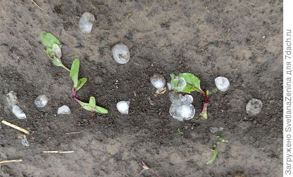 С утра 2 июня заметила на всходах свёклы первые настоящие листочки. Так как накрапывал дождь, то не стала выносить фотоаппарат. Вот только слабый дождь сменился ливнем, а затем и градом. Что-то вбило, что-то оторвало. Но выжили.