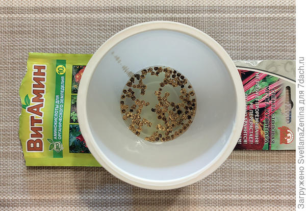 По рекомендации производителя перед посевом на 2 часа замочила семена с аминокислотами «Витамин», разведя пакетик (10 г) в 2 л воды.