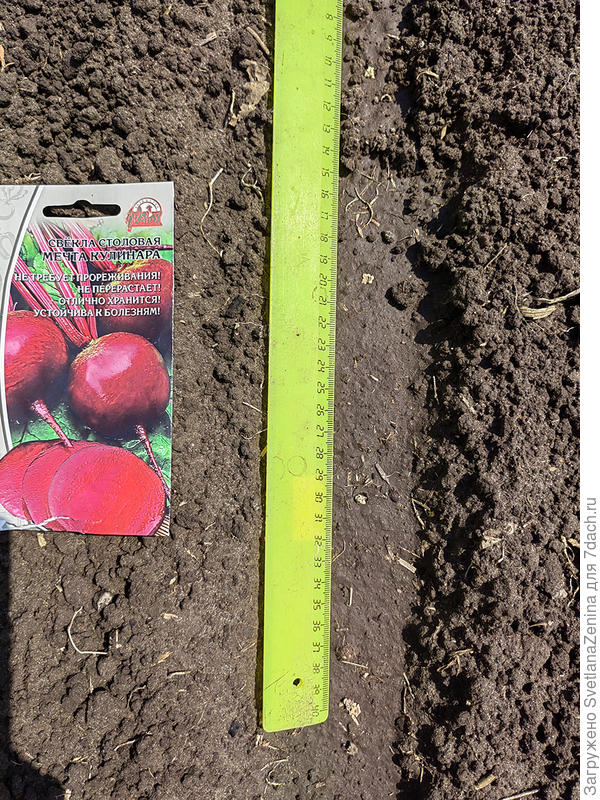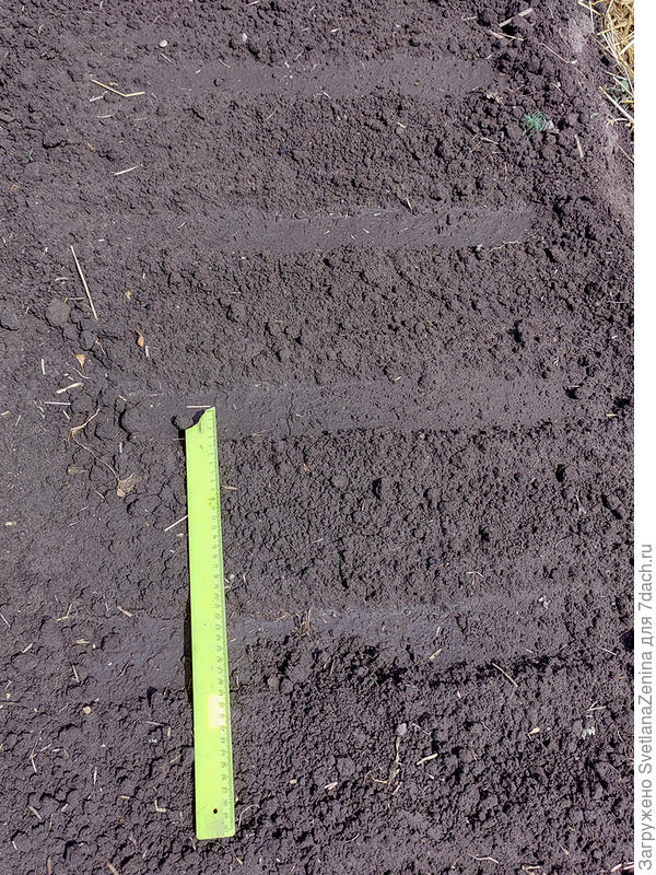 На отдалении 25 см друг от друга сделала поперечные бороздки, пролила их водой и разложила семена на расстоянии 10 см между ними.