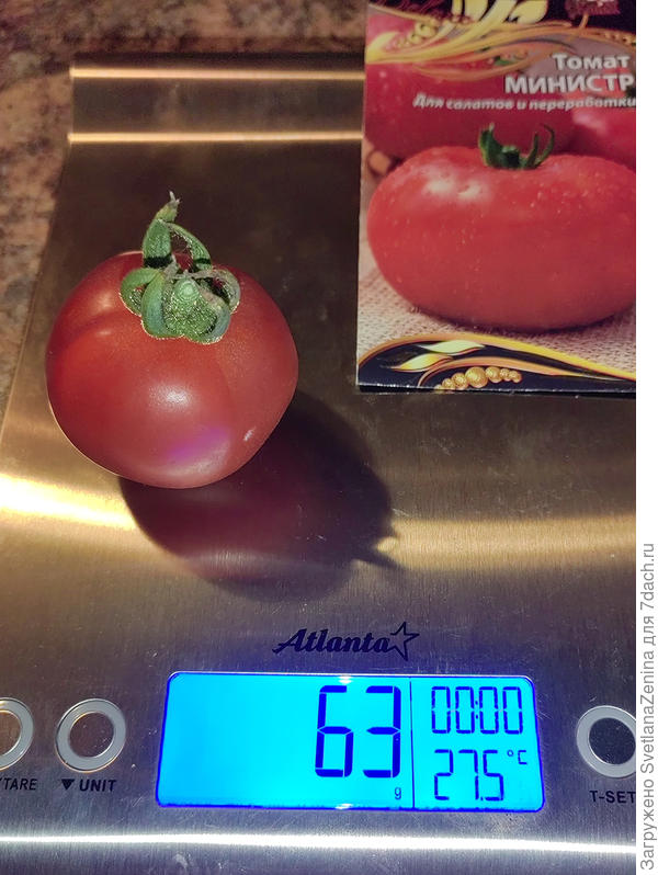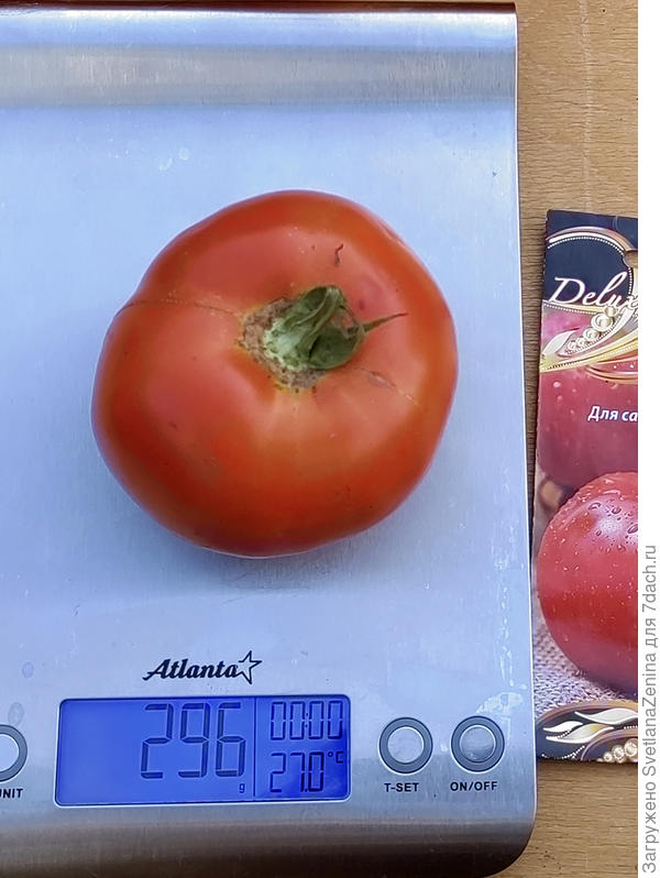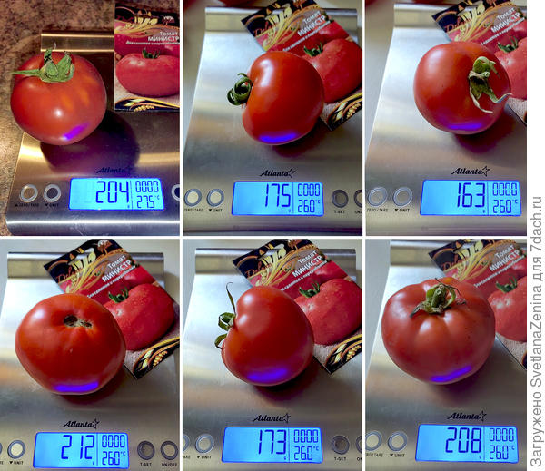 Зафиксированный вес составил 5 кг 489 г с двух кустов или 39 плодов. Что, конечно, не соответствует действительности, так как на каждом кусту было по 12-13 кистей с 2-6 плодами в каждой. Т.е. на каждом кусту созрело не менее 30 томатов.
