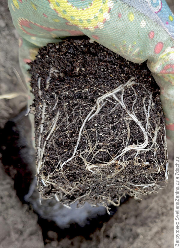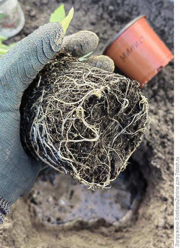 Корневая система хорошо развита. Напомню, возраст рассады 30-32 дня, и росла она в 0,5 литра индивидуальных горшочках.