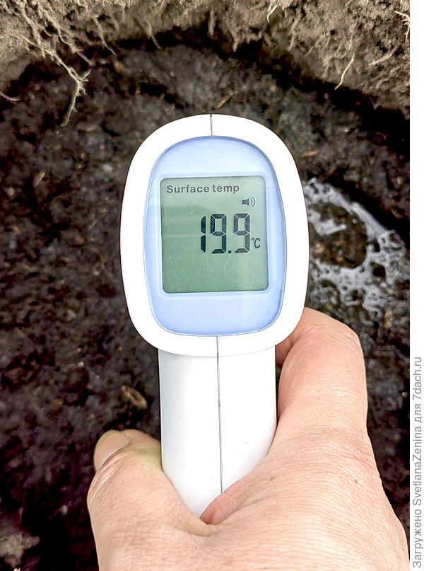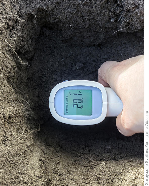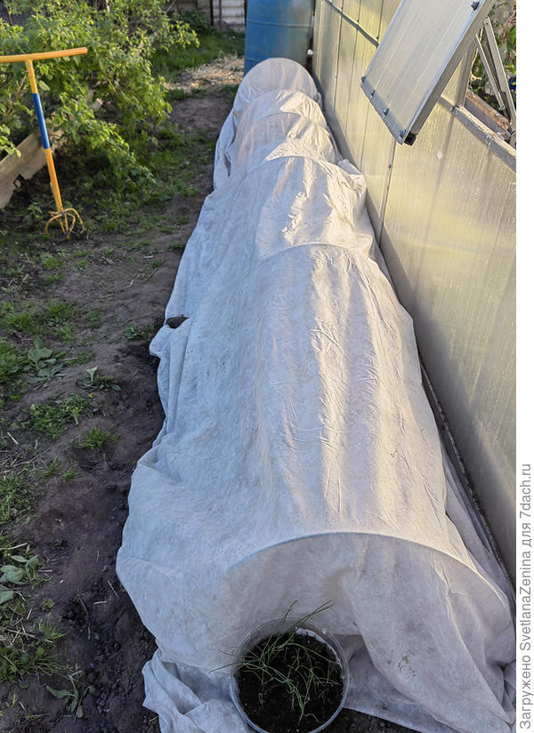 После посадки на улице укрыла белым укрывным материалом от солнца и ещё прохладных ночей. При посадке температура на улице к вечеру опустилась до +18,8. В лунке была +20,1.