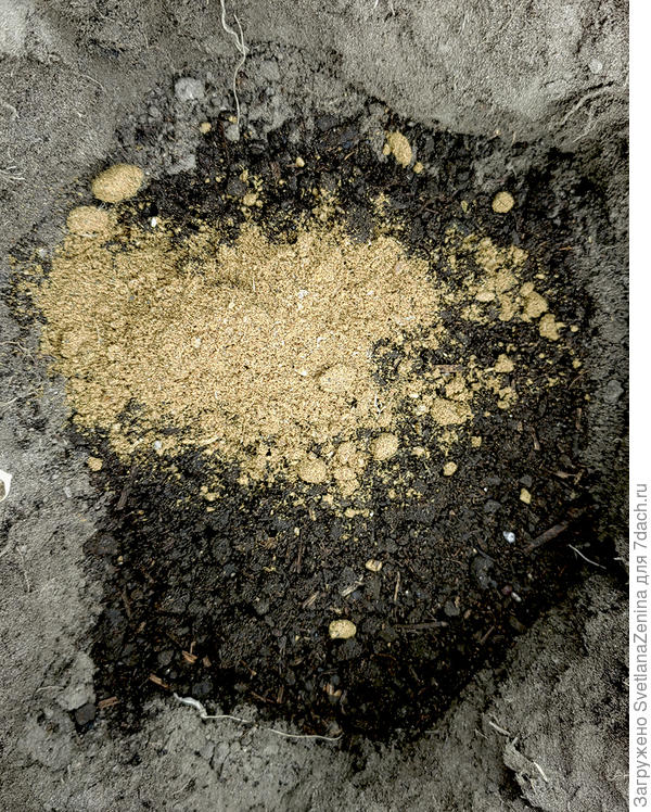 В лунку на дно насыпала щепоть горчичного жмыха, перемешала, добавила ложку золы, перемешала. Затем две горсти Биогумуса от Ткаченко и столовую ложку рыбной муки. Хорошо перемешала, кинула 3 гранулы НВ-101, залила водой. Поставила томат, не разрушая земляной ком. Засыпала землёй, полила водой, замульчировала сухой землёй.