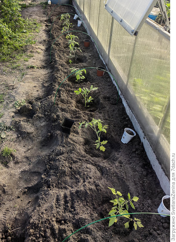 В теплице с осени по весну росли сидераты: овёс, горчица, люпин. За пару недель до посадки томатов сидераты убрала и вскопала землю. В день посадки оставалось только сделать лунки.