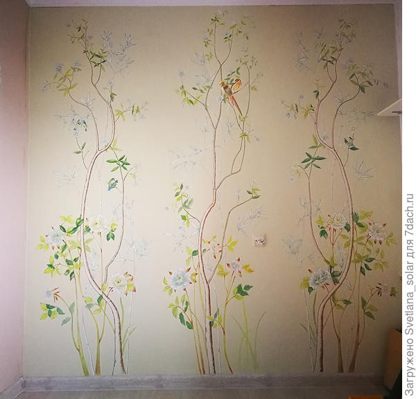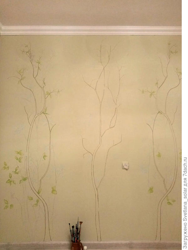 Выполняем роспись стены, прорисовываем кистью основные элементы, деревья, цветы и птицы.