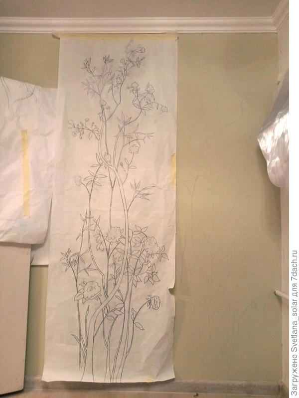 Приступаем к переносу эскиза с кальки на стену, кальку крепим с помощью малярного скотча.