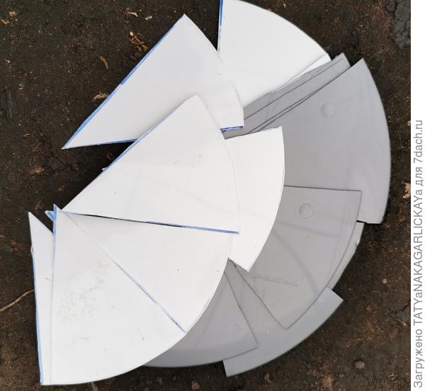 Срезаю каёмку таким образом, чтобы получился плоский круг. Его расчерчиваю на секторы, а затем разрезаю. Крышки превращаются в таблички (следы от маркера легко стираются).