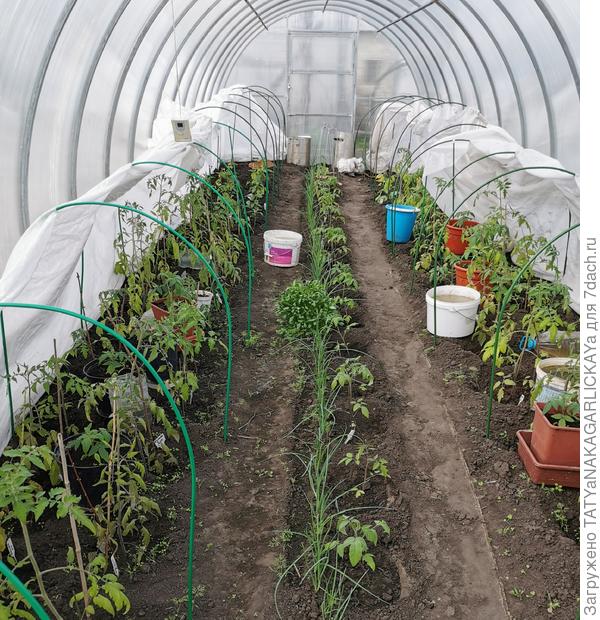 И снова я возвращаюсь в прошлую осень, чтобы коротко рассказать, как появились совмещенные, а в нашем случае — уплотненные посадки в теплице. Тогда в ноябре 2021 г., после осенней высадки лука в открытый грунт, остались крохотные луковички, им попросту не хватило места на грядке. Пока подыскала для них новое место и приготовила грядку, неожиданно похолодало. Подготовленная грядка замерзла, а луковички остались не у дел. Оставшийся севок было жаль, за зиму от него ничего бы не осталось. Выход был один — это теплица, перепаханная и удобренная, подготовленная к новой весне. Что-либо сажать или сеять там в зиму не собирались, а уж совместные посадки вообще не планировали, ни осенью, ни весной, т.к. теплица ежегодно перенаселена: засажена и заставлена. Но в тесноте, да не в обиде. В срочном порядке была организована грядка-бороздка во всю длину теплицы для лука севка. Других вариантов, как прямо посередине посадить лук в сделанную бороздку, не было. Так было положено начало совместных, уплотненных посадок в теплице. Весной лучок весь взошел. Таким был лук на старте.
