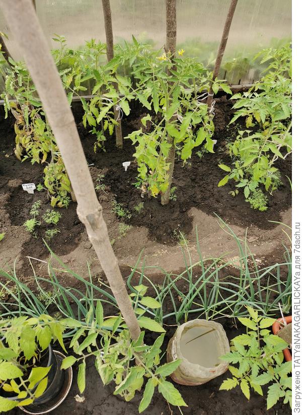 Больших надежд на него никто не возлагал, рос он по краю томатов, в прямом смысле бок о бок с ними. Вместе обе культуры росли, поливались, рыхлились и подкармливались удобрением «Здравень-турбо» универсальное. Как оказалось, они имеют хорошую совместимость. Наградой за спасение остатков семенного материала стал ранний урожай лука. Но, я забежала вперед, возвращаюсь в то время, когда лук понемногу подрастал, наглядно покажу его рост.