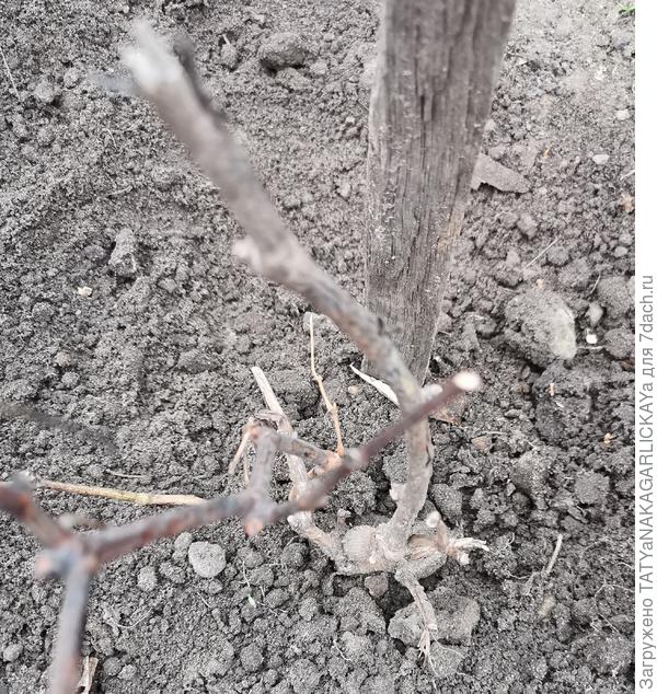 Опрыскиваем саженец и землю вокруг. На момент опрыскивания листьев на виноградном кустике уже нет: то, что надо.