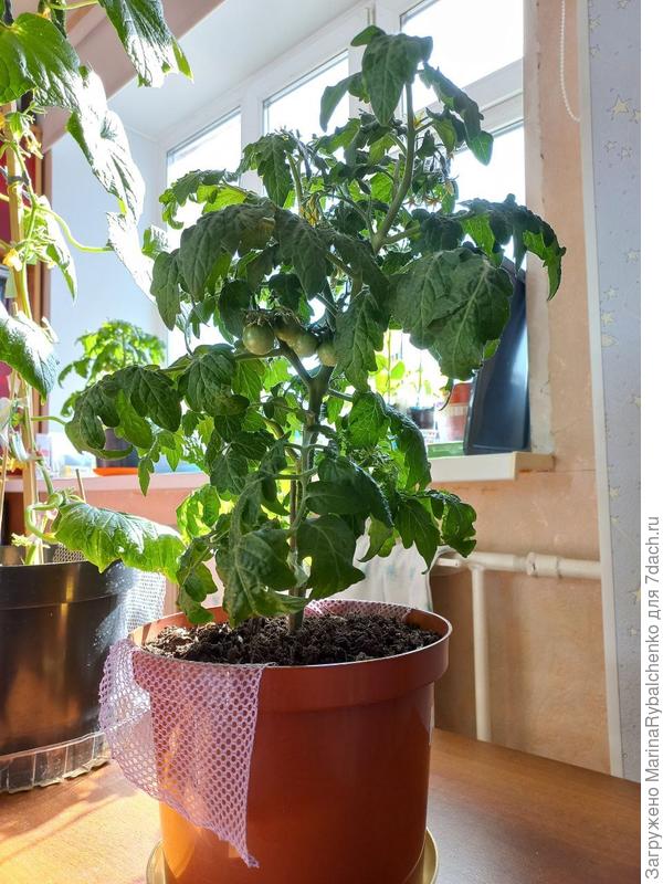 В марте стала выставлять томат на застекленную лоджию, в солнечный день там бывает выше +20, томат греет листочки.
