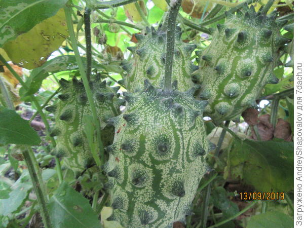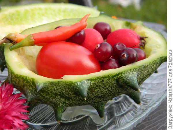 Зелёный помидор я не рвала, он почему-то сам упал, странный какой-то. Стручковая фасоль уже последняя, а острый перчик — самый первый, он ещё зелёный, но на вид не особо перспективный, так что пойдёт сразу в дело. Вокруг него — стручки бамии и первый отысканный в буйных зарослях кивано. На вид — полная экзотика, а на вкус — обычный огурец.