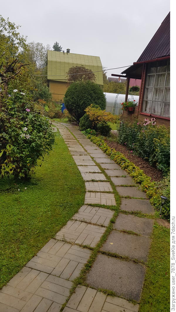 Раз уж бегала с тяпкой, заодно сгребла землю с каменных ступенек. В этом месте получается самый крупный перепад высот на моей даче, и его оформляли вот такими плитами. В общем-то, я не против, пусть хоть такое подобие камней на участке будет.