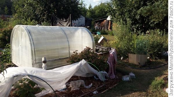 Покажу смехотворный кадр участка — для спасения от солнца приходится прикрывать посадки всем чем попало, агроволокном, картоном, завешивать тканью. Вид смешной. Между прочим, в парнике пророс арбуз, сам из прошлогодних косточек. Ждём )).