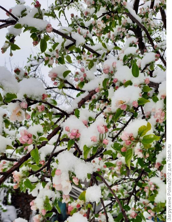 Насколько можно понять, абрикосы успели отцвети до катаклизма, но вот успели ли завязаться — понять сложно. Я пыталась кое-кого поотряхивать, но снег липучий, вцепился намертво. Остаётся положиться на рок и фатум.