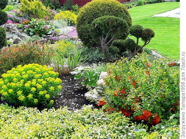 Это почвопокровный декоративный раскидистый кустарник, размером не больше метра в высоту и ширину. Растет на солнечном месте под яблоней.