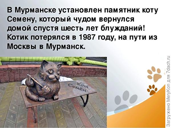 Свет, а меня в свое время очень тронула вот эта история памятника коту Семену в Мурманске.