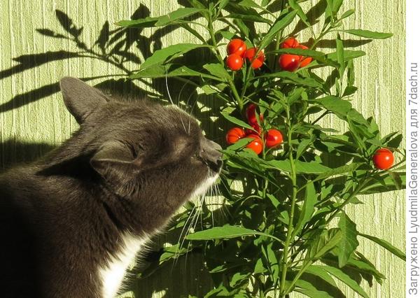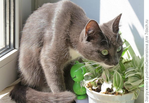 Кошки хоть и плотоядные животные, но зелёная травка им нужна для улучшения пищеварения и как витаминная добавка. Особенно они уважают пырей, валериану, мяту. Весной наша «девушка» может попробовать на зуб сочный листочек традесканции. Для этого и ставим на пол горшочек. Едва сойдет снег, как появляется пырей, и проблема с зелёной добавкой отпадает.