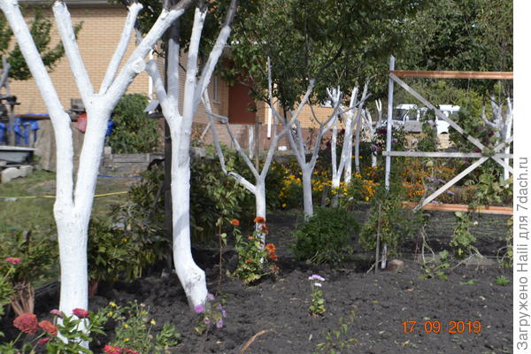 Как уже писал, белю для красоты, а от зайцев ствол окутывал сеткой, а в настоящее время сеткой не окутываю и зайцы не трогают стволы.