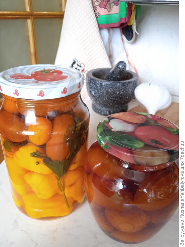 Вот сегодняшнее, остыло, перевернул. Полуторку взял исходя из странноватых соображений — в пачке больших крышек была крышка с нарисованными на ней яблоками, ну и я под это дело решил подобрать банку и повидло яблочное положить. И еще одна закатная крышка тоже с какими-то фруктами, среди которых на рисунке яблоки присутствуют, её я тоже решил не хранить а использовать. Закатные крышки у нас в пачках, и там их много, но все простые, а одна из крышек в пачке — расписная красивенькая, видимо вроде подарка кладут. Остальные банки — завинчивающиеся крышки, зеленая б/у, "помидоры" — новые куплены в пачках. Еще у меня есть какие-то итальянские, что ли, банки, у них крышка завинчивающаяся но какой-то совсем не такой стандарт, и еще есть банки с горлышком уже стандартных 82 мм, и еще похожие, но отличающиеся миллиметра на четыре. Вот эти необычные крышки я без понятия где в данный момент искать. Хотя это скорее хобби, у меня странная мания подгребать пустые банки где попало кто выбросит, отмывать их кипятком с порошком и содой до блеска, и в них консервировать. Ну и крышки все разные ))