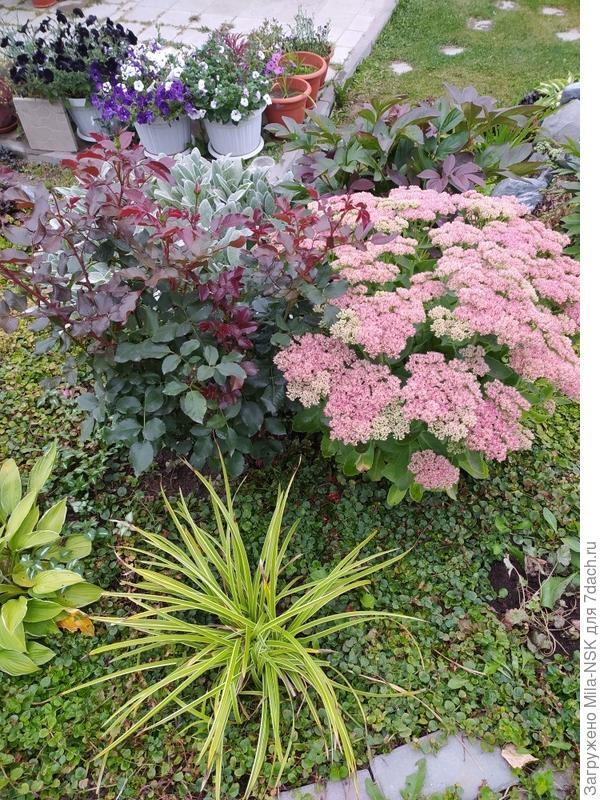 Посмотрела на ваши очитки и хочу похвалить свой Очиток Видный. В этом году как никогда отдельные соцветия дали красивый яркий оттенок ( в прежние годы были более пастельных тонов) — уж не знаю с чем это связано, но глаз так и просится- полюбоваться на эти пышные шапки!