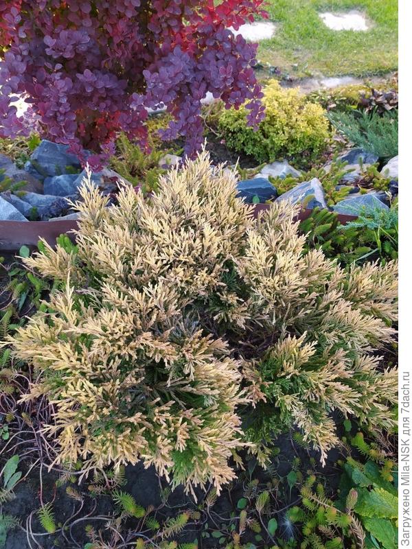 Если на фото между можжевельником и золотой сосенкой, то это осока. Она растёт такими компактными кустиками. Хотя любит выстреливать детишками😉 Я их периодически откапываю и раздаю. Но самое интересное, что вот именно в этом месте детишек практически нет. А вот в другом цветнике мне приходится их удалять.