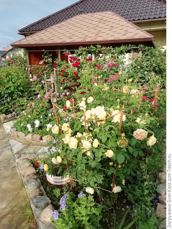 Розарий немного больше огорода. Но на огород не жалуюсь, растет все, что надо, с томатами, огурцами, перцем, луком, чесноком, спаржевой фасолью, тыквой, кабачкам, свеклой и морковью проблем нет. Только картофель не выращиваю совсем. Есть ещё клубника, малина, голубика, жимолость… И несколько фруктовых деревьев.Так что места хватает всему: и для души, и желудка