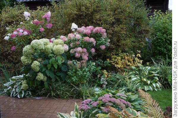 Большинство метельчатых гортензий в начале цветения белые, а позже розовеют. Вот те же гортензии в начале августа. Ещё беленькие.