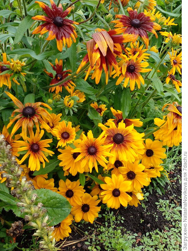 А у меня пока один и тот же сорт, но цветёт по-разному! Тот, которому не хватало влаги — выдал красивые цветоносы, но светлее, чем в нижнем саду и не такими крупными шапочкаи