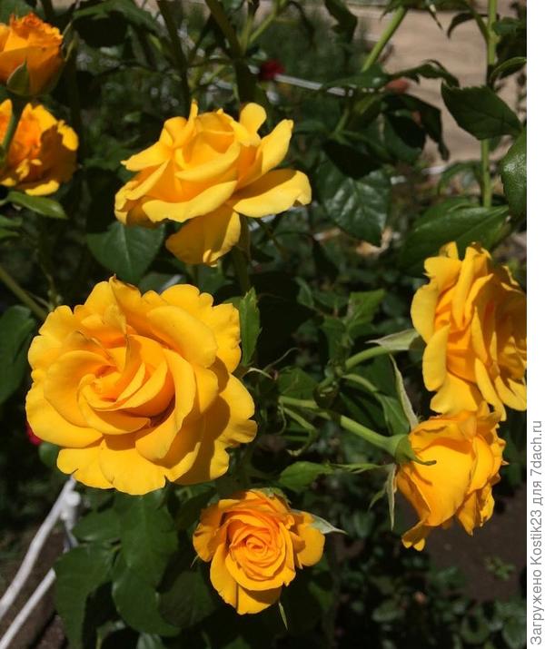 Очень люблю розы таких оттенков — оранжевых и желтых. В этом году купила у Татьяны Максимовской розы -спрей, желтые и оранжевые. Саженцы с ОКС. Дошли хорошо, но как на грех погода подвела. После потепления, вдруг минусовая температура. В общем, пришлось высадку отложить на неделю. Дома при плюсовой температуре за неделю саженцы стали медленно, но верно загибаться. В общем, к моменту высадки они были не в самом лучшем состоянии. Чуть живые. Пришлось побеги у двух роз обрезать по самое не хочу. Перед высадкой замочила на ночь в растворе фитоспорина. Сажала и плакала, думала что половина точно не приживется. Хорошо, что в отпуск пошла, отливала водой каждый день. У нас после холодрыги сразу резко стало жарко. И каждый день смотрела, не чернеют ли побеги. Когда на них стали появляться листочки, я поняла, что все таки выходила. Все семь розочек. Теперь буду ждать цветения!