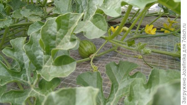 На одном сорте дынь уже явно чем то болеют. Мало обрабатывала для профилактики. Есть несколько маленьких арбузиков, видимо где то плеть не прищипнула, может тоже успеют, если плети не засохнут.