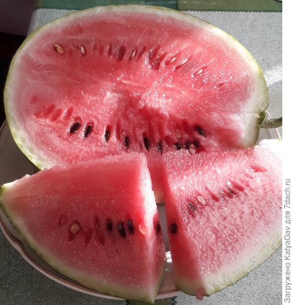Что-то расстраивают арбузики в этом сезоне… 🙁 Сняла Кримсон Свит, ему бы зреть и зреть, но усохло всё, включая плодоножку. Сочный и сладкий, конечно, но ещё не «сахарный».