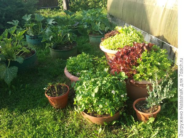 Кстати, это фото позапрошлого года — в прошлом немного другая ксртинка была, на один низкий большой контейнер больше, а горшков не было