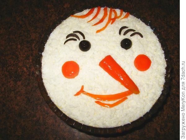 Вот так снеговичком (любимым персонажем ) украшала как-то салат.