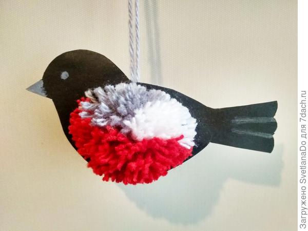 Ой, точно, Рушана! Милые птичечки совсем другие. А я набрала снегири из ниток, выплыл вот такой — из картона и ниток, по типу, как раньше делали помпоны. То есть вырезает две чёрные картонные заготовки птички, делаешь отверстия круглые внутри и обманываешь тремя цветами ниток. Затем разрезать, а две половинки склеить. Рушана, честно нравится?