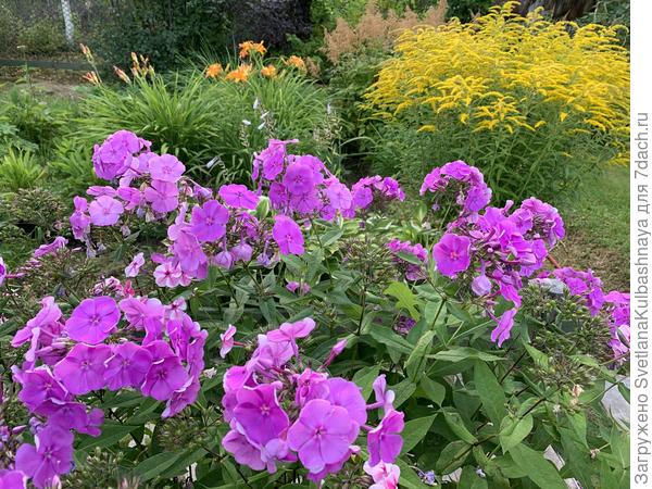 А сейчас в полном цвету клематисы, розы цветут не переставая, георгины, бергамот, бархатцы, космея, флоксы — всё цветёт.