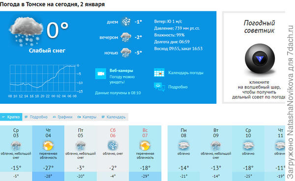 Впереди ужас, ужас, ужас! Сегодня ночью — 27. В следующие три дня 2, 3, 4 января -24 — 27 днем, — 28 — 32 ночью. И до конца недели чуть теплее, но ночами за — 20. Еще сегодня утром цифры были немного выше. С каждым просмотром становится все холоднее и холоднее. 🙂