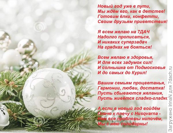 Новый год — пора надежд и веры в чудо. Хочу пожелать всем в новом году крепкого-крепкого здоровья, семейного счастья, любви, удачи! Пусть неудачи и потрясения обходят вас стороной, занимайтесь любимым делом, верьте в себя и в свои силы и всё у вас получится! Финансового благополучия, сбытия мечт и пускай этот злосчастный ковид наконец отступит, и люди вздохнут свободно в полном смысле этого слова!