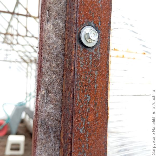 Уплотнительные резинки были разные по форме и толщине. Т, к каркас теплиц металлический, то клеила их к каркасу дверного проема и притягивала стяжками.