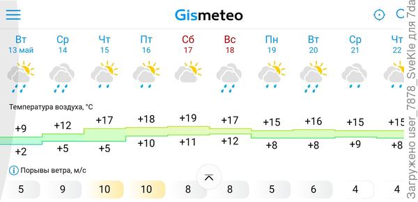 У нас так раскочегарилось, что хоть в футболке работай. Правда +14 но на солнышке довольно жарко. Никакого дождя с 11 по 13 не было. Ну и слава богу
