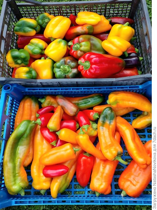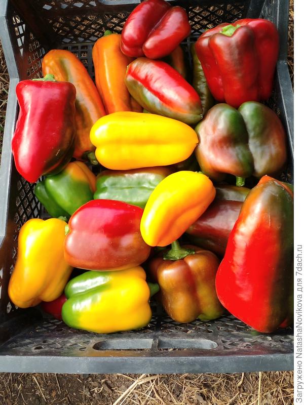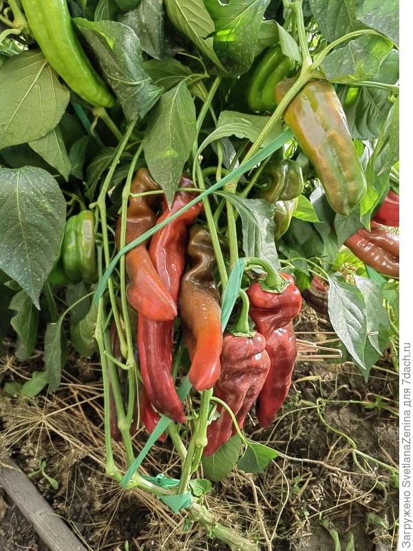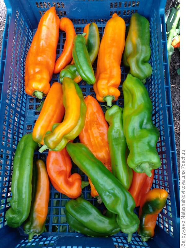 Сортов было много. Порадовали урожайностью — Златогривый лев, Ингрид, Калифорнийское чудо, Пилот, Мамонтенок, Испанский сладкий, Союз, Звезда Востока, Рамиро красный, Рамиро желтый, Маркони золотой. Не фотографировала практически урожай.