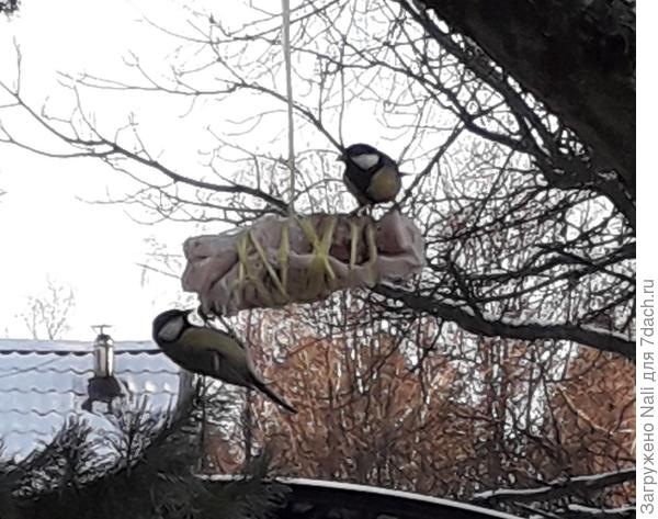 Несколько раз вывешивала, на шкурке, без шкурки… Мясо на суп, сало на веревочку. Нет, не клюют