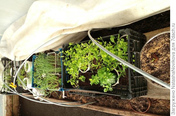 на крышу теплицы накинула старенький укрывной №30 в два слоя, в теплице под крышей то же укрывной, под дугами стоят луки и цветы — лобелия, аллиссумы, хризантемы, канны, бархатцы,