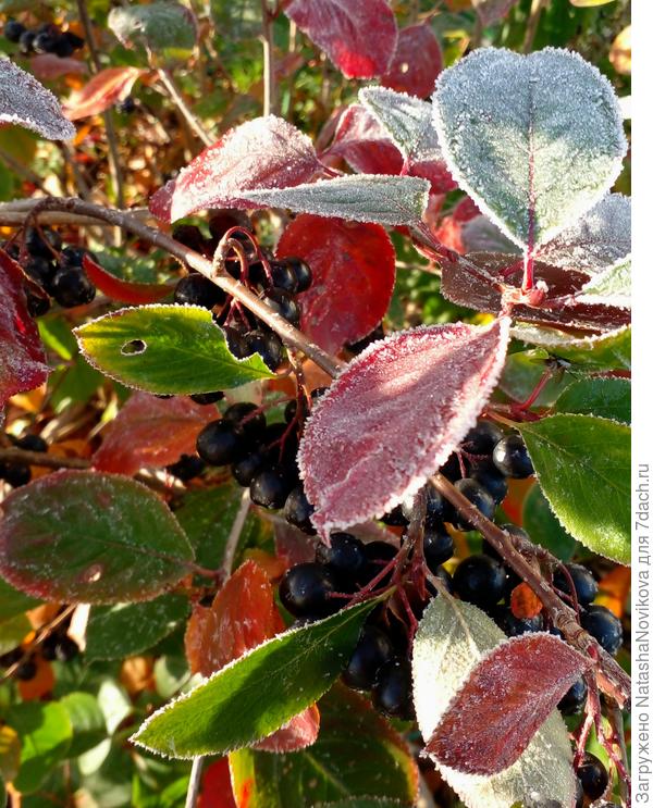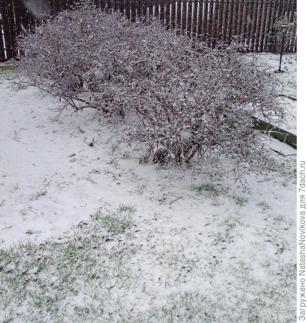 кустарники листья не сбрасывают, клён, арония, гортензии, посконики — все с листвой стоят, хотя и чернеют листья, но ещё крепенько держатся,